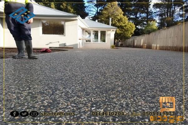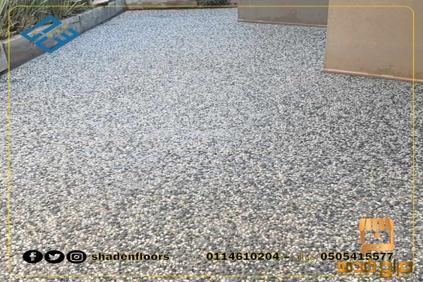 أرضيات البحص بالراتنج: تُستخدم راتنجات خاصة لتثبيت الحصى. تُعد هذه الأرضيات أكثر مرونة في التصميم وأقل تشققًا مقارنة بالأرضيات الأسمنتية.