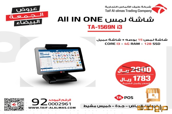 (شاشةكاشير لمس مزوده بواي فاي وشاشة عرض للعميل+طابعة فواتير حراري+درج نقود خمس خانات +قارء بركود+برنامج المبيعات والمشتريات والمخازن)