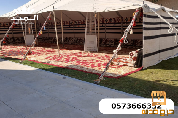تتوفر خدمات التأجير بمساحات متعددة تناسب عدد الضيوف والموقع، مع إمكانية تجهيز الخيام بالكامل من الداخل بالأثاث التراثي، والإضاءة الدافئة، والمكيفات أو الدفايات حسب الموسم. كما يمكن توفير جلسات عربية، وطاولات ضيافة، وسجاد تراثي يضفي لمسة جمالية فريدة.