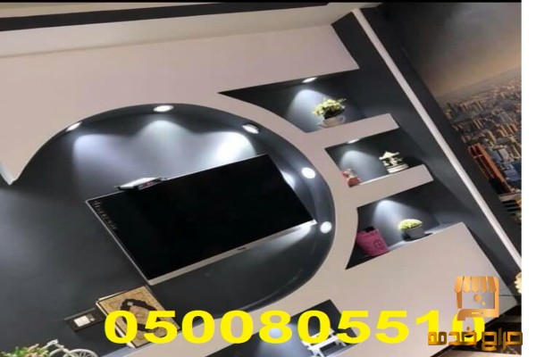 الخزائن والأدراج: يمكن دمج خزائن وأدراج من الجبس تحت أو بجانب الشاشة لتخزين الأجهزة والإكسسوارات.