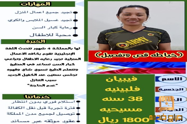 يجيدون جميع اعمال المنزل من تنظيف وغسيل ورعاية اطفال والاهتمام بكبار السن ومنهم مهنة كوافيرة وممرضة وخياطة وببىبى ستر وسائقة وعاملة نظافة الخدمة 24ساعة العمل يومى نسعى لخدمتكم وارضائكم للتواصل ابو خالد 0538913367