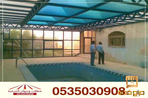 مظلات ثابتة: تُركب هذه المظلات بشكل دائم بجانب المسبح وتوفر حماية مستمرة من الشمس والمطر.