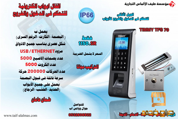 ●القفل الإلكترونى timmy tfs 70 -يعمل( ب البصمة-الكارت-الرقم السرى) -القفل يعمل على جميع الابواب (الحديد-الخشب-الزجاج) -مزود بداخل USB / ETHERNET -جودة عالية بضمان ip 66 -مزود بقطعة مغناطيسية ذات قوة عالية سعة ذاكرة 5000 بصمة سعة ذاكرة 5000 كروت عدد الحركات يصل الى 200,000 بسعر 12150 ريال قبل الضريبة ضمان عامان التركيب مجانا